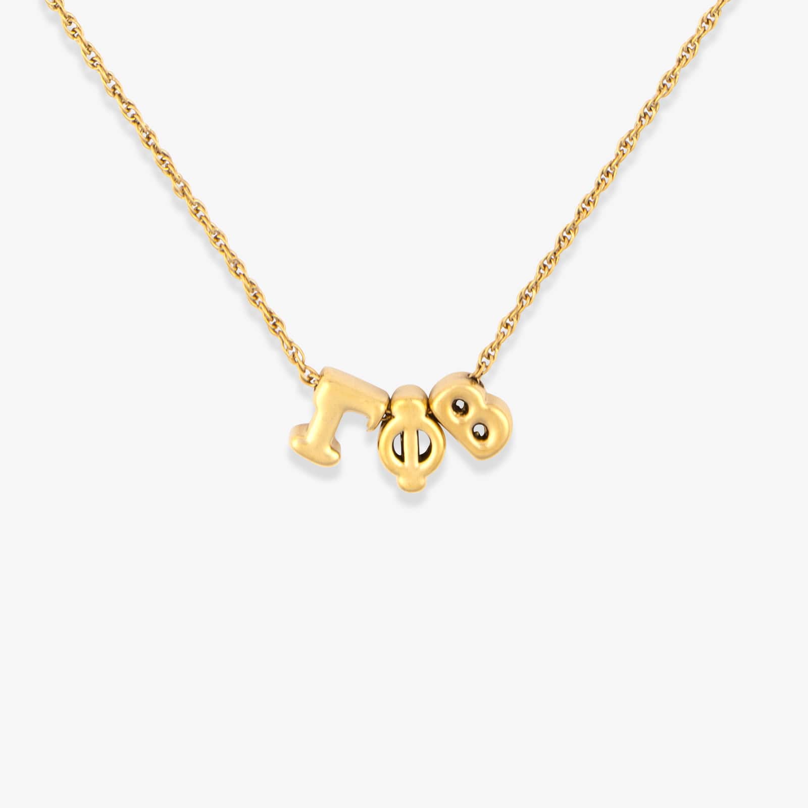 - Features bubble-style Greek letters with a stainless steel base and IP gold plating